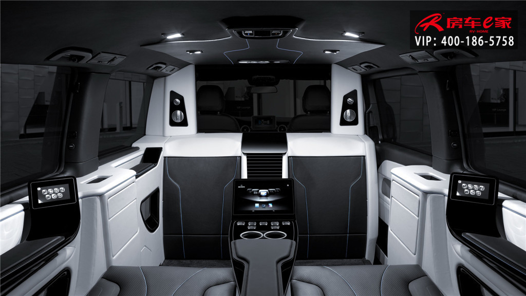 内饰由黑色和白色交织充满商务气息,配上蓝色的线条又极具运动感,整车巴博斯系统充满高科技感,电动升降玻璃窗可变幻透明度,电动桌板可进行自由调节,控制界面除两个豪华座椅中间有一个中央控制系统外,也可以通过云平板操控整车。VIP座椅采用巴博斯面料包覆,与众不同的座椅结构:隐藏式冰箱、储物箱、保险箱、红酒柜、咖啡机。内饰看起来简洁大气,体验感。